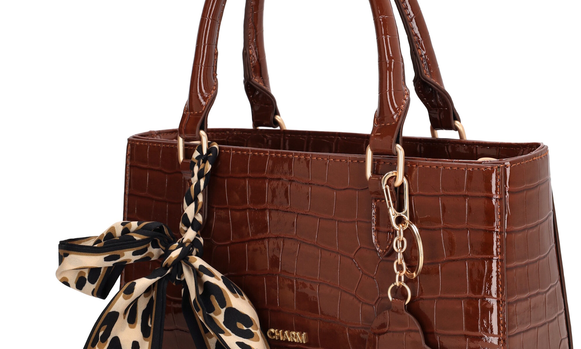 • De Charm London Knightsbridge Handtas is een elegante tas met een stijlvolle croco laklook. Dankzij de dubbele handvatten draag je deze tas comfortabel in de hand of over de arm – perfect voor een dagje uit of een chique gelegenheid.